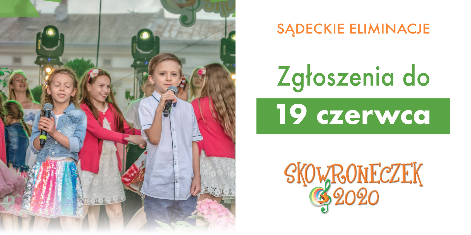 Do 19 czerwca zostaje wydłużony termin zgłoszeń do sądeckich eliminacji XVII Międzynarodowego Festiwalu Piosenki Dziecięcej SKOWRONECZEK. Do udziału zapraszamy dzieci i młodzież w wieku 5-16 lat z terenu miasta Nowego Sącza.